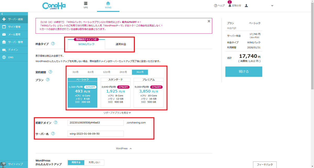 WINGパックだと利用期間中ドメインが無料になるので、サーバー費用だけでお得になります。