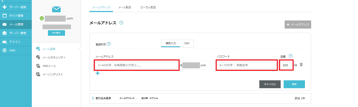 サーバーや独自ドメインを決めると、メールアドレスの作成ができます。